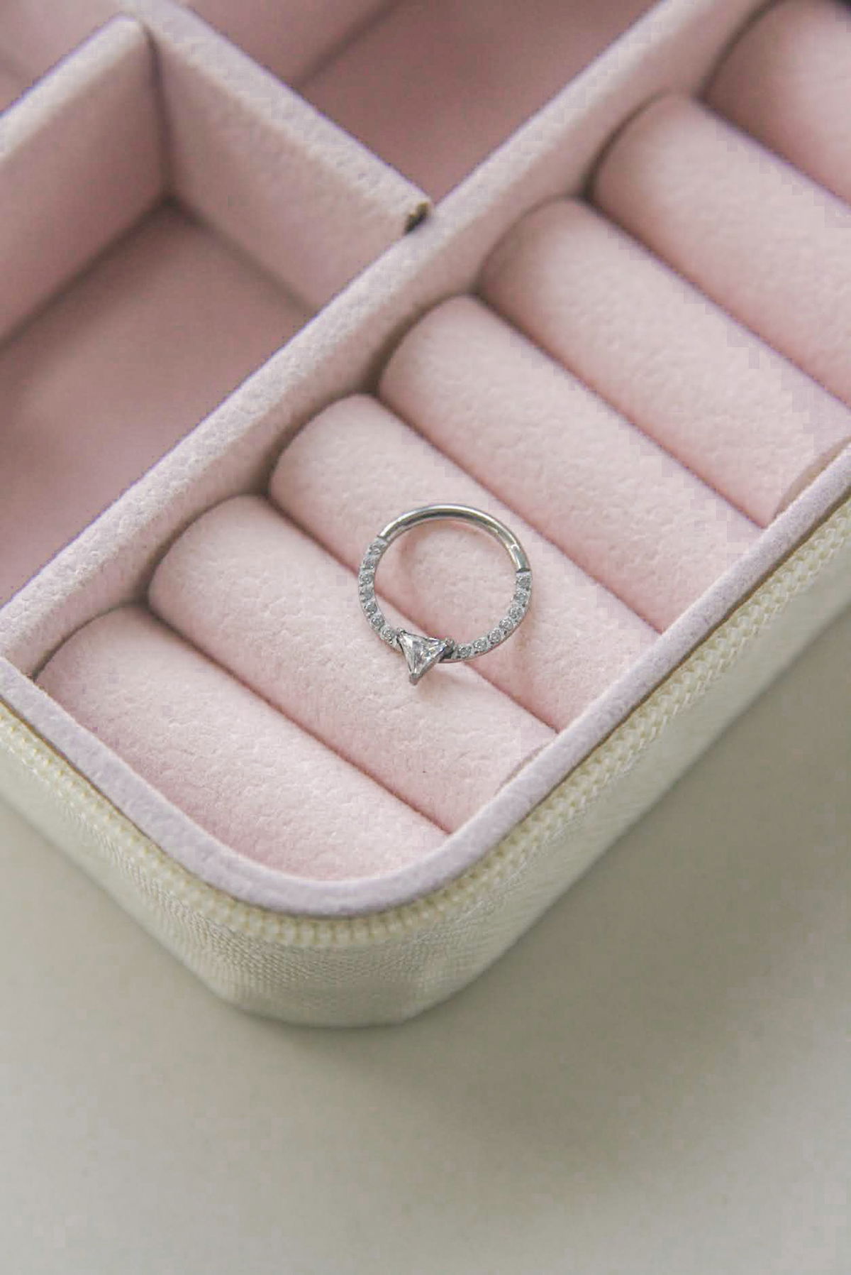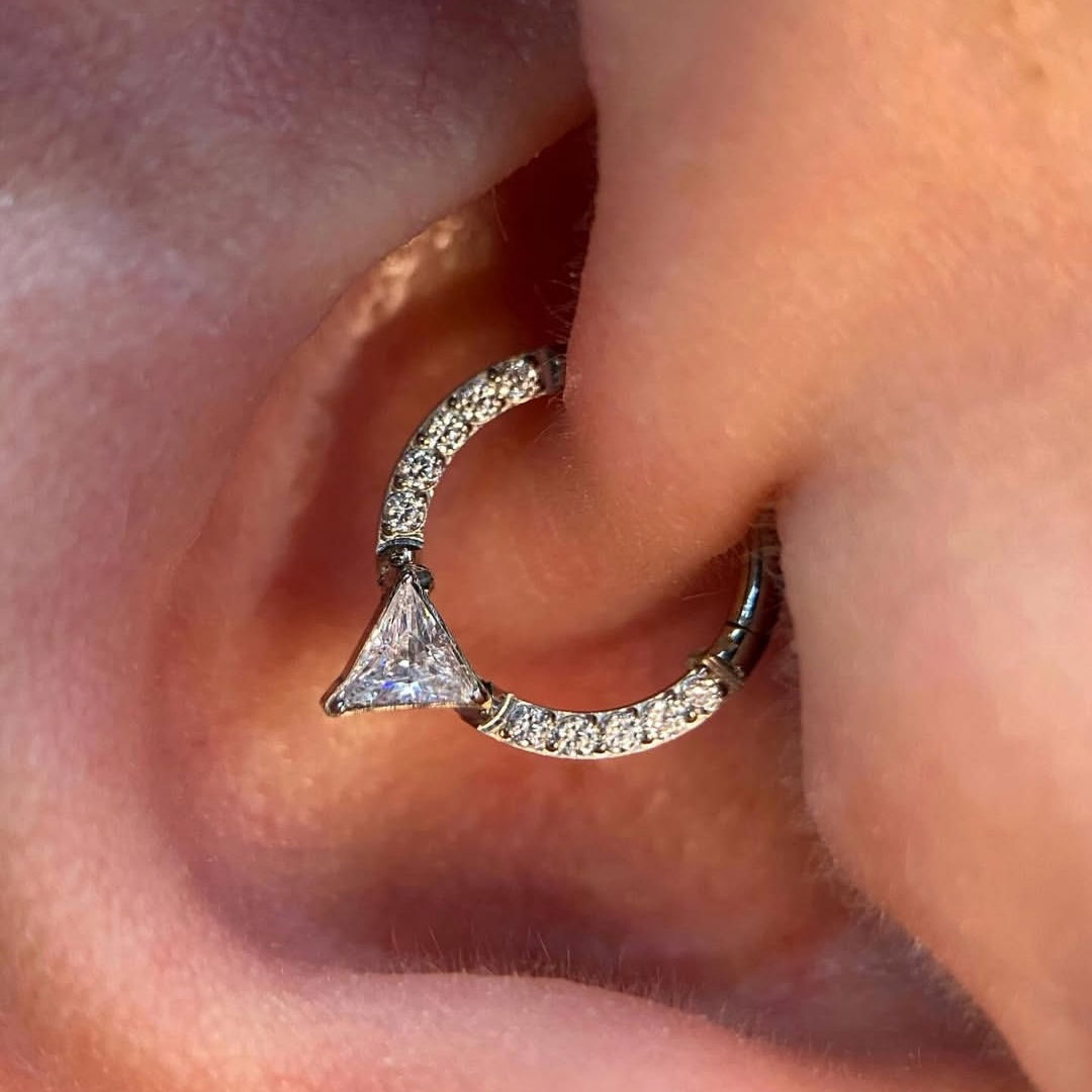 Argolla clicker con triangulo y circonitas blancas en el frente. Este tipo de piercing se puede usar en las perforaciones: hélix, daith, lóbulo, septum