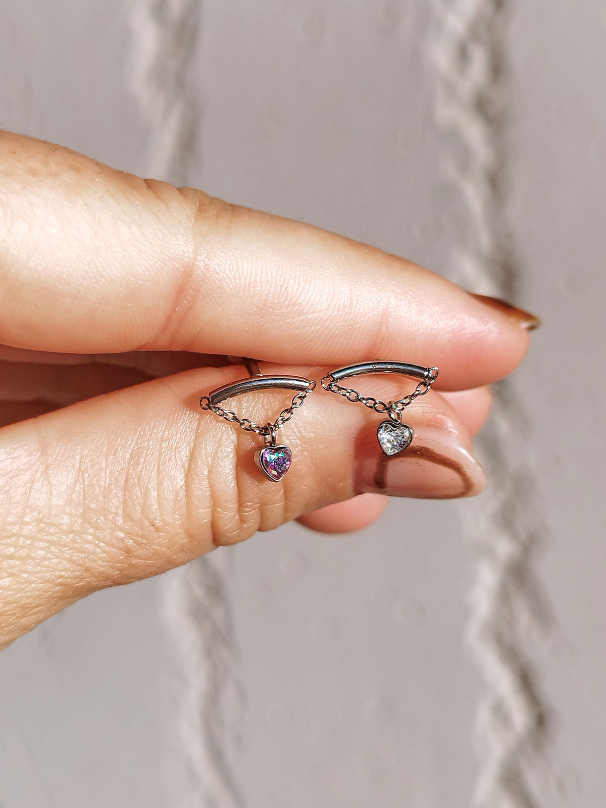 Piercing labret barra con cadena y dije corazón. Este tipo de piercing se puede usar en las perforaciones: flat, hélix, hélix vertical y lóbulo