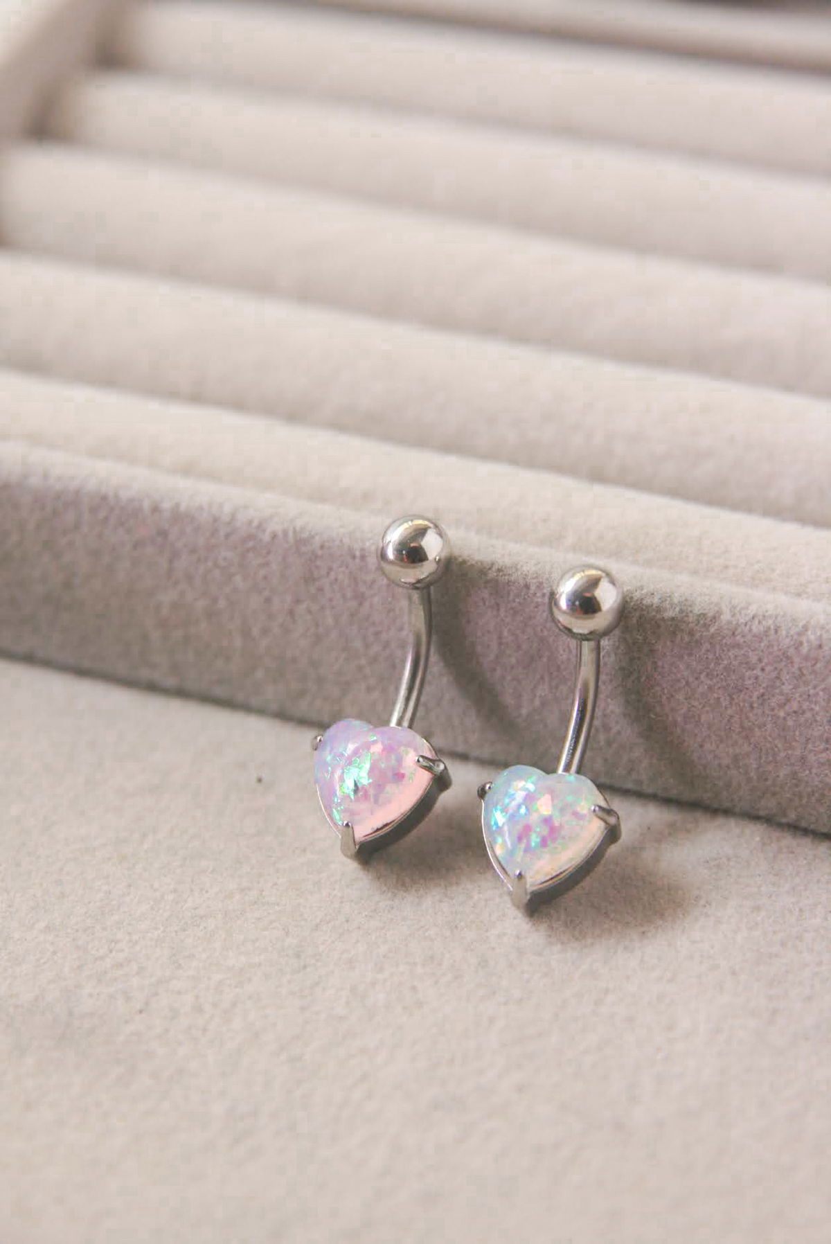 Piercing para el ombligo clásico con corazón ópalo rosa/tornasol. El color del cubic del modelo tornasolado cambia según la luz. Este tipo de piercing se puede usar en la perforación del ombligo