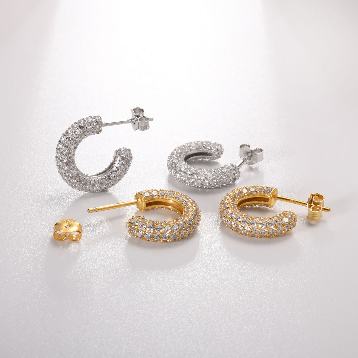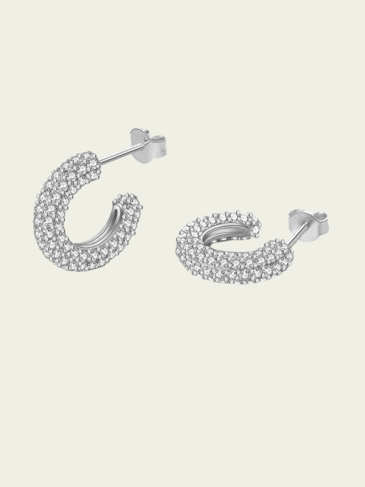 Los aros Malva son aros semi argolla con mini circonias blncas incrustadas. Este tipo de aros se puede usar en el lóbulo o lóbulo superior