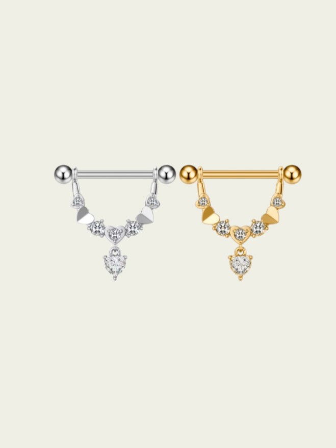 Pezonera con colgante de cubic y corazones. Este modelo podes usarlo con el colgante o solo la barra. Este tipo de piercing se puede usar en la perforación del pezón