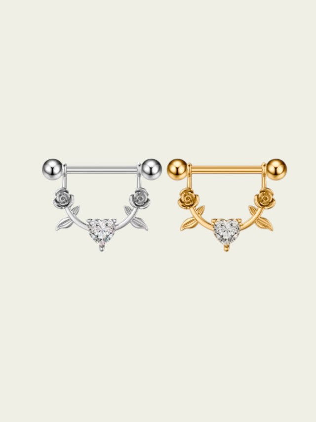 Pezonera con colgante con flores y corazón cubic. Este modelo podes usarlo con el colgante o solo la barra. Este tipo de piercing se puede usar en la perforación del pezón