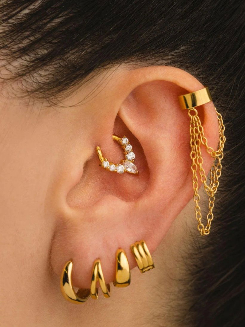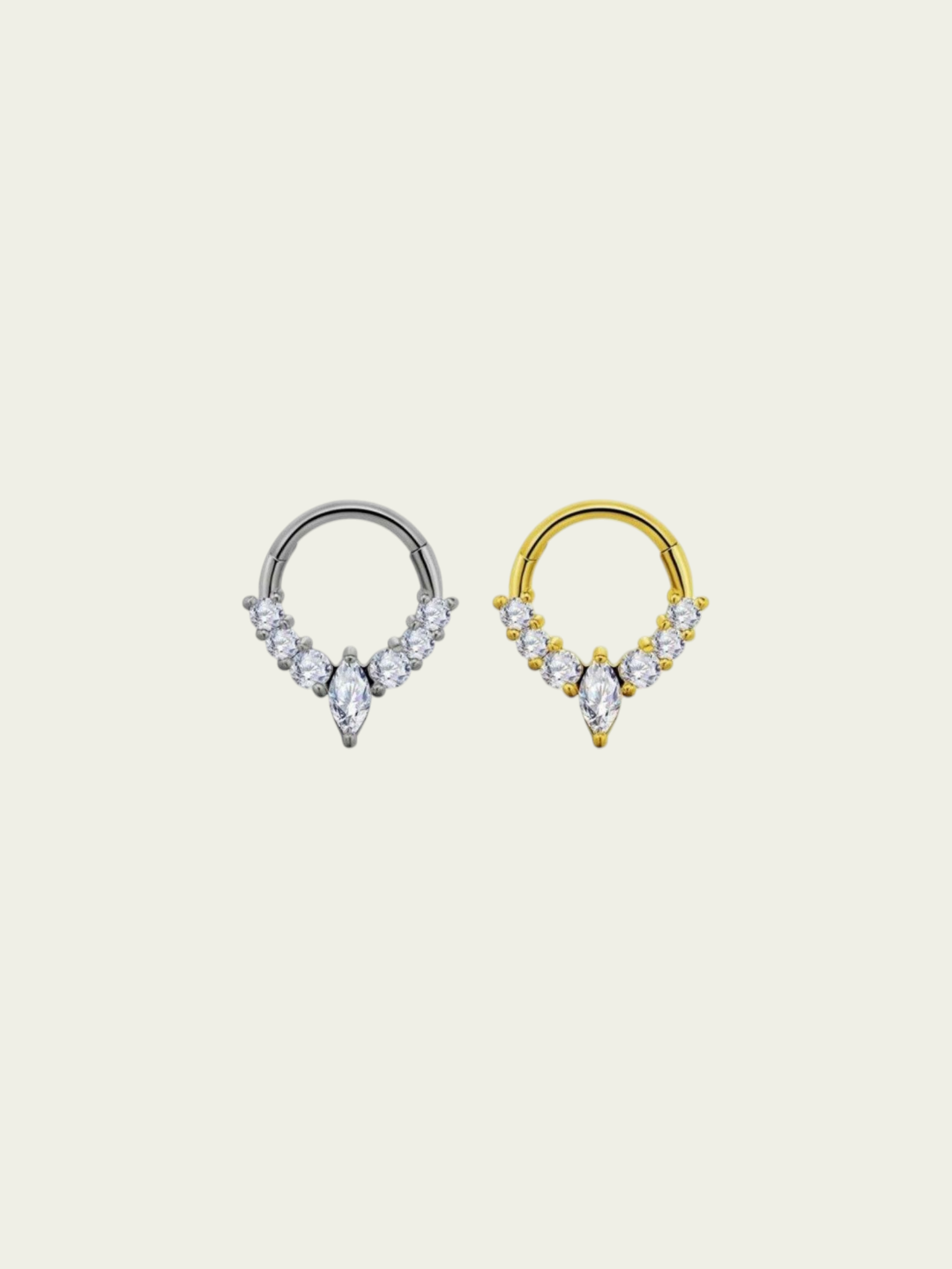 Argolla clicker cubics. Este tipo de piercing se puede usar en las perforaciones: 1er, 2do y 3er lóbulo, hélix, septum y daith (ver foto abajo)