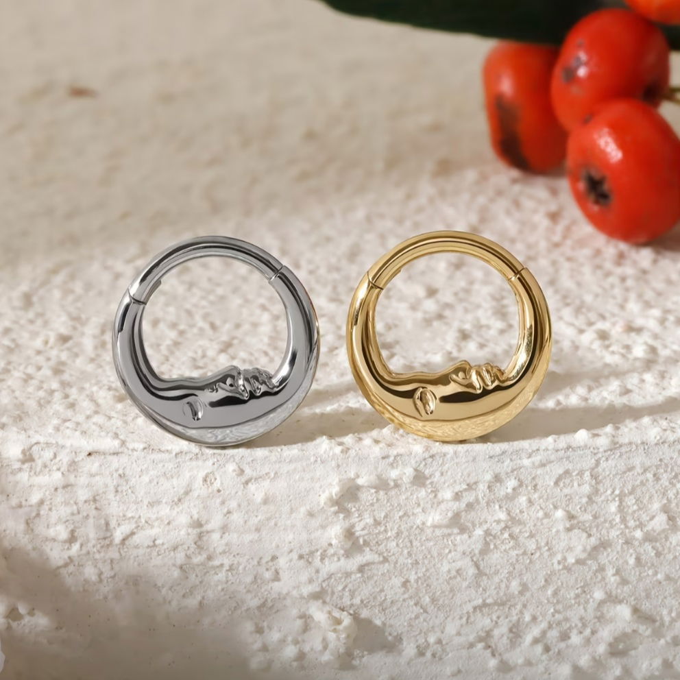 Argolla clicker Luna. Este tipo de piercing se puede usar en las perforaciones: 1er, 2do y 3er lóbulo, hélix, septum, daith (ver foto abajo)