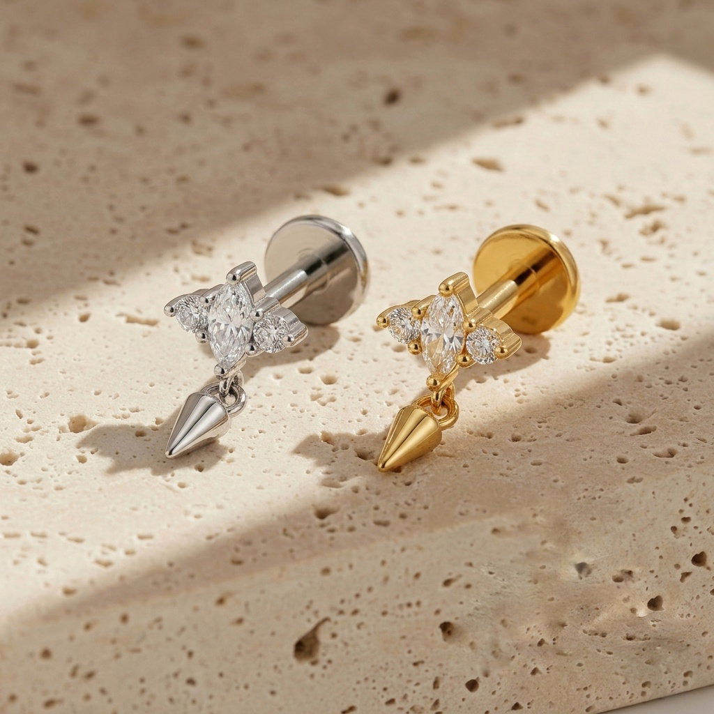 Piercing labret cubics con colgante. Este tipo de piercing se puede usar en las perforaciones: flat, hélix, contra hélix, conch, lóbulo y tragus