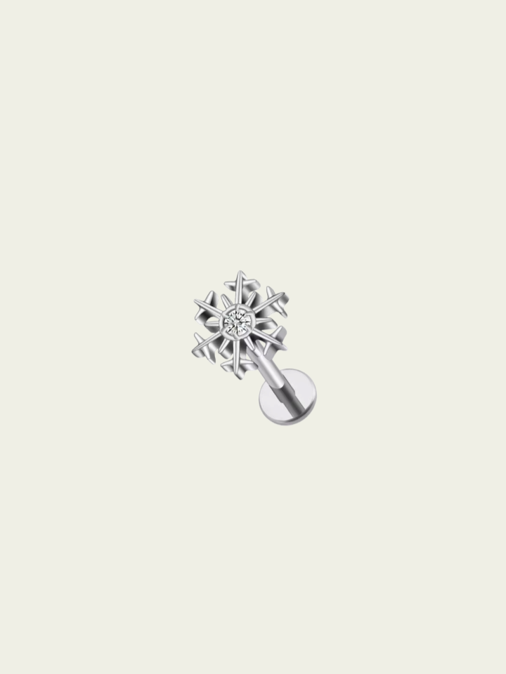 Piercing labret Copo de nieve mini. Este tipo de piercing se puede usar en las perforaciones: flat, conch, hélix, contra hélix, y lóbulo