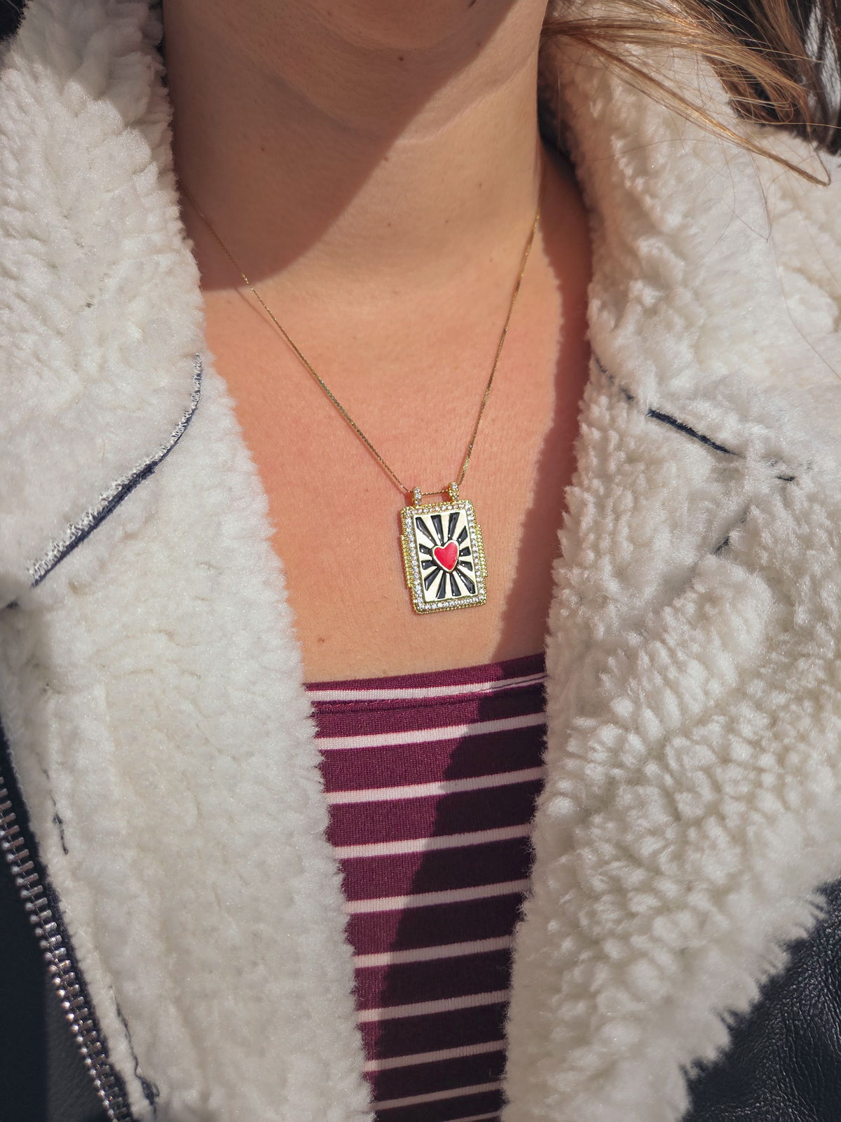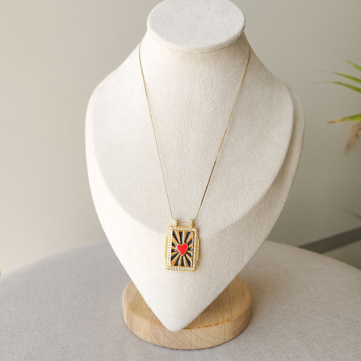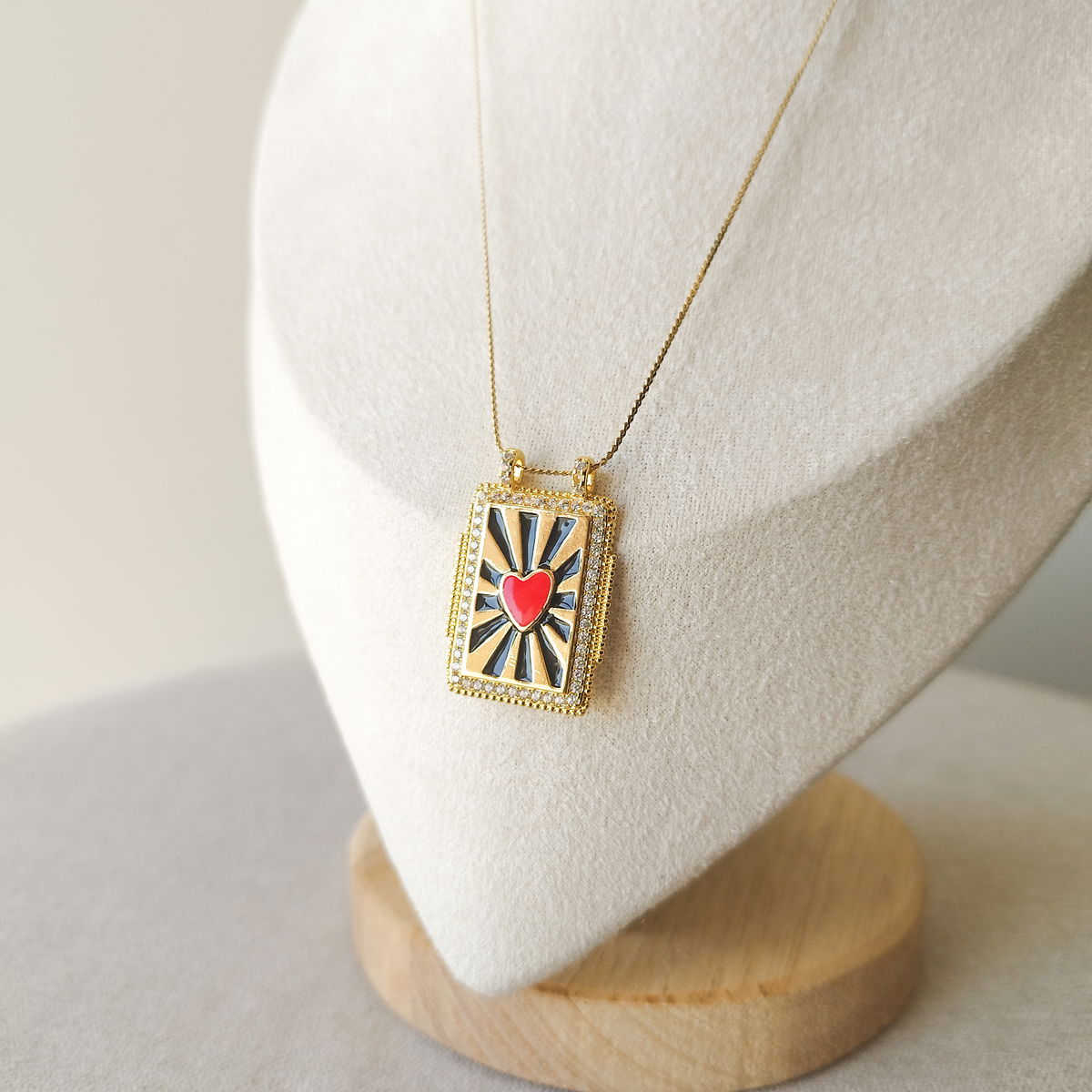 Conjunto de cadena fina con dije rectangular corazón rojo con lineas negras. Por el esmaltado del dije este producto no se puede mojar