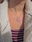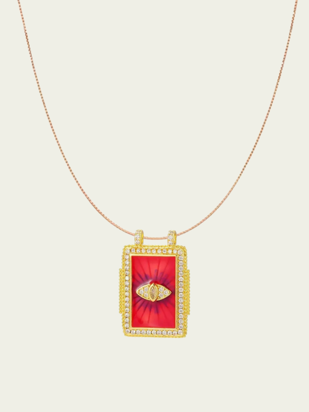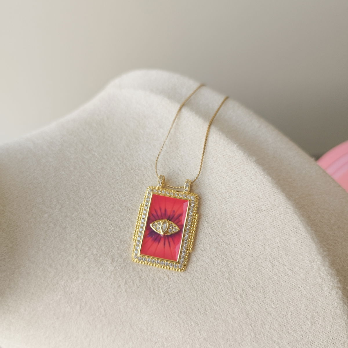 Conjunto de cadena fina con dije rectangular con circonias blancas y dije protector en el centro. Por el esmaltado del dije este producto no se puede mojar