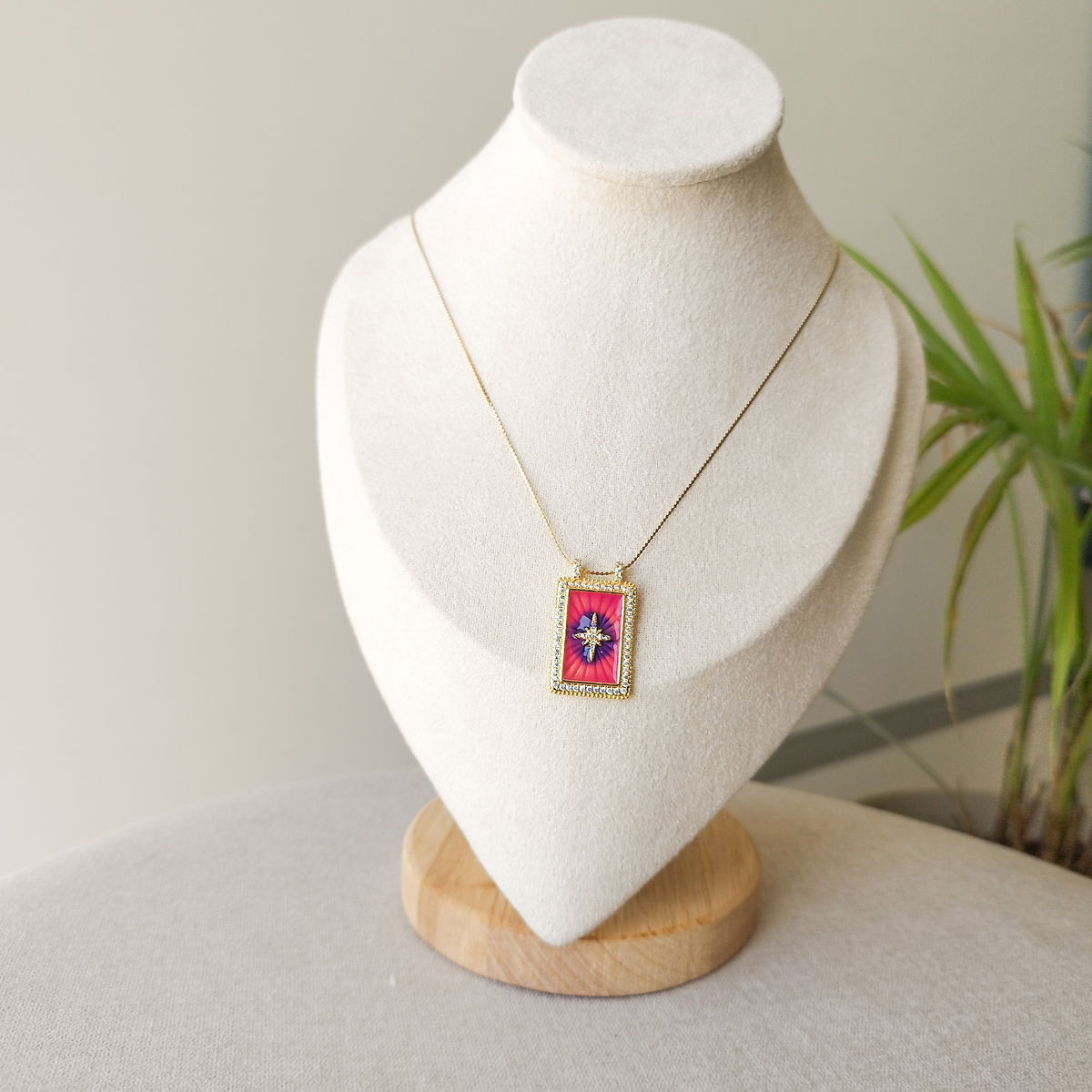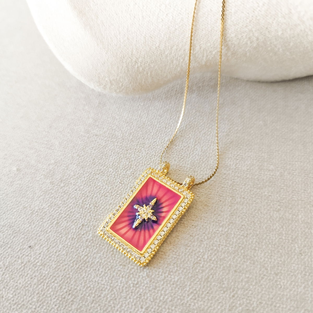 Conjunto de cadena fina con dije rectangular con circonias blancas y dije estrella. Por el esmaltado del dije este producto no se puede mojar