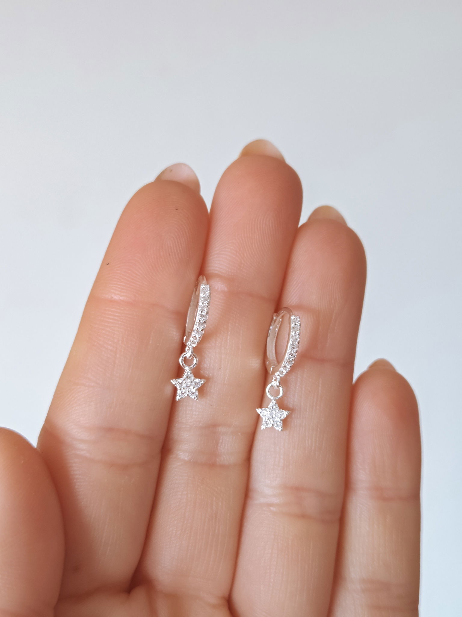 Las argollas estrellas son argollas estilo huggie con circonias blancas engarzadas, tienen un charm colgante con forma de estrella! π Este modelo se puede utilizar en las perforaciones: 1er, 2do y 3er lΓ³bulo (ver foto abajo)