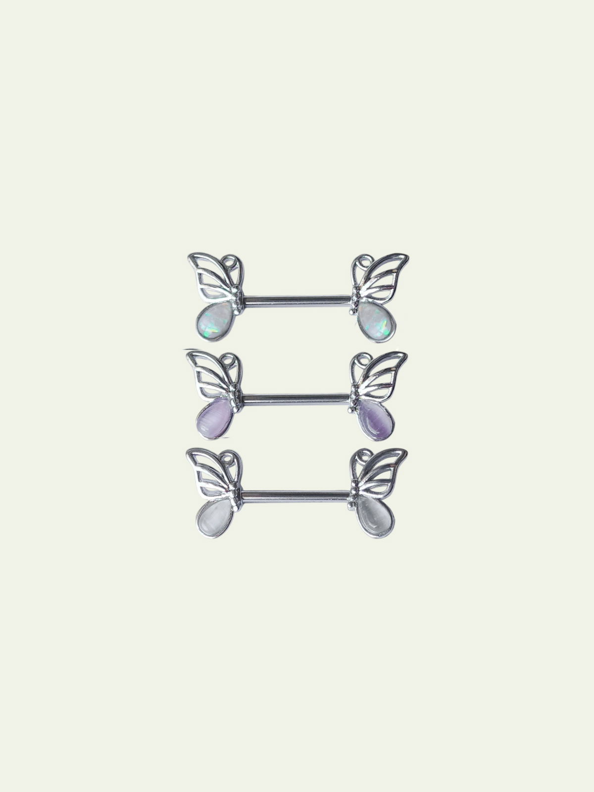 Barbell para el pezón estilo mariposa con ópalo. Este tipo de piercing se puede usar en la perforación del pezón