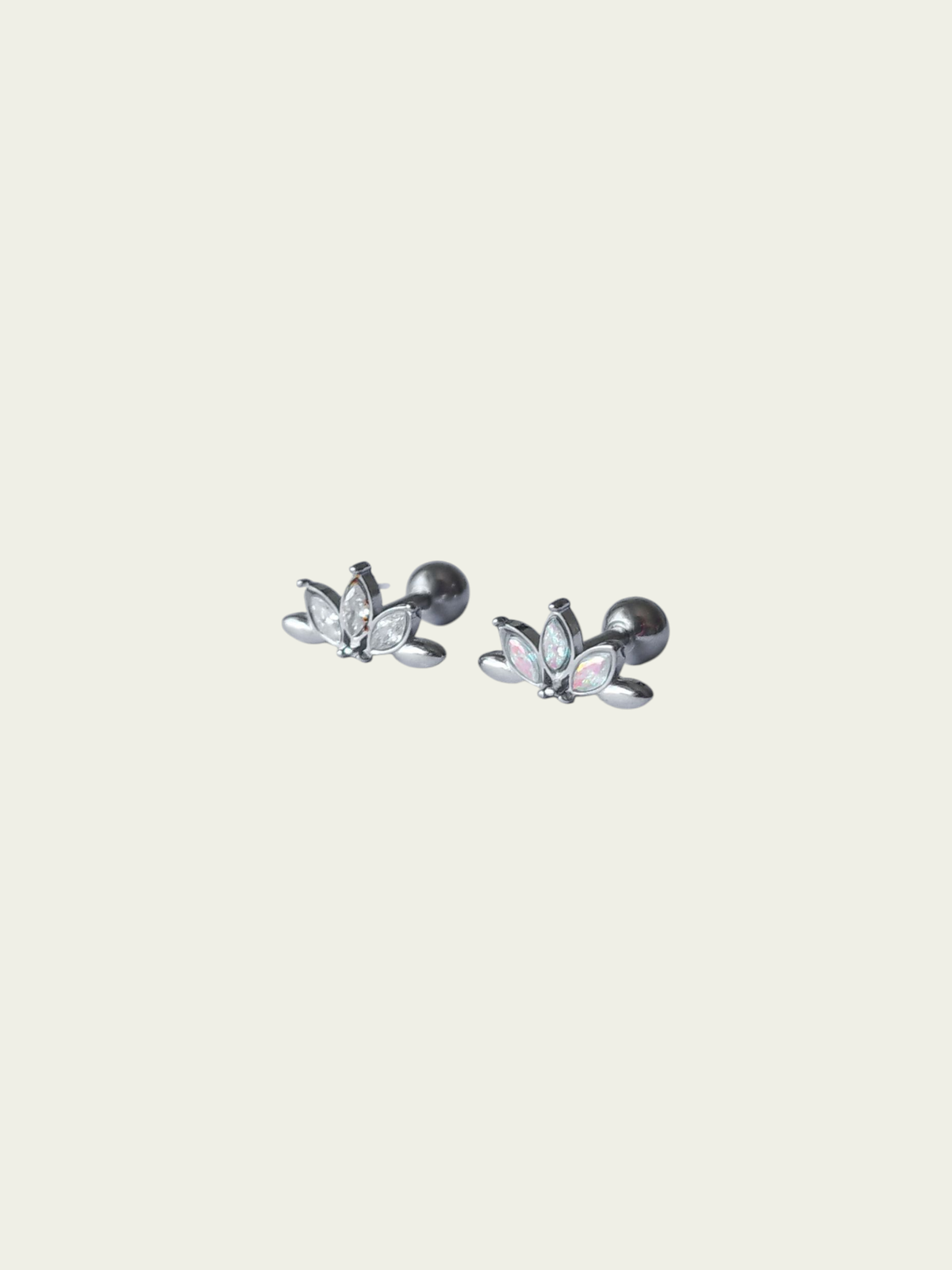 Aro barbell flor con cubic blanco/tornasol. Este tipo de piercing se puede usar en las perforaciones: flat, hélix, conch, 1er, 2do y 3er lóbulo (ver foto abajo)