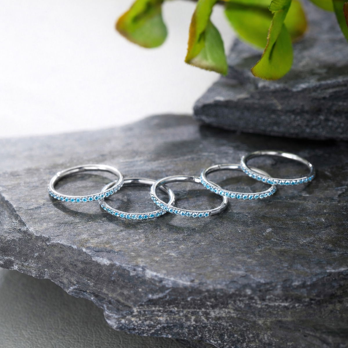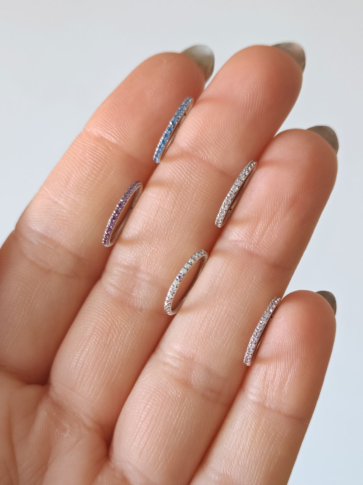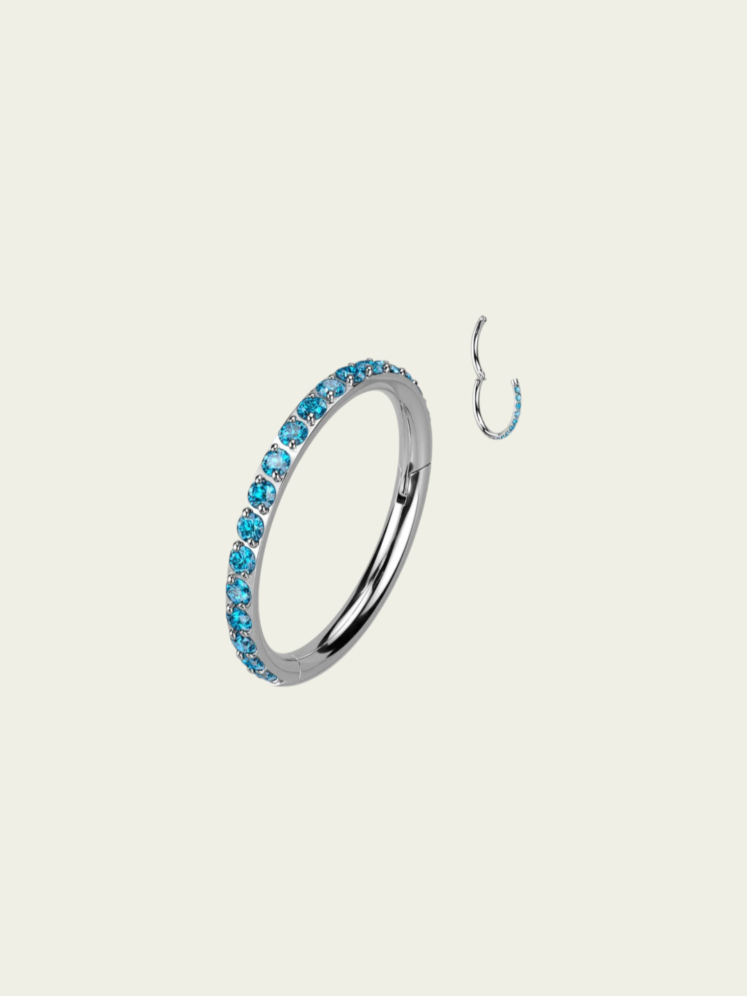 Argolla clicker circonias celestes. Este tipo de piercing se puede usar en las perforaciones: nostril, ombligo, tragus, rook, labio,conch, hélix, contra hélix y lóbulo