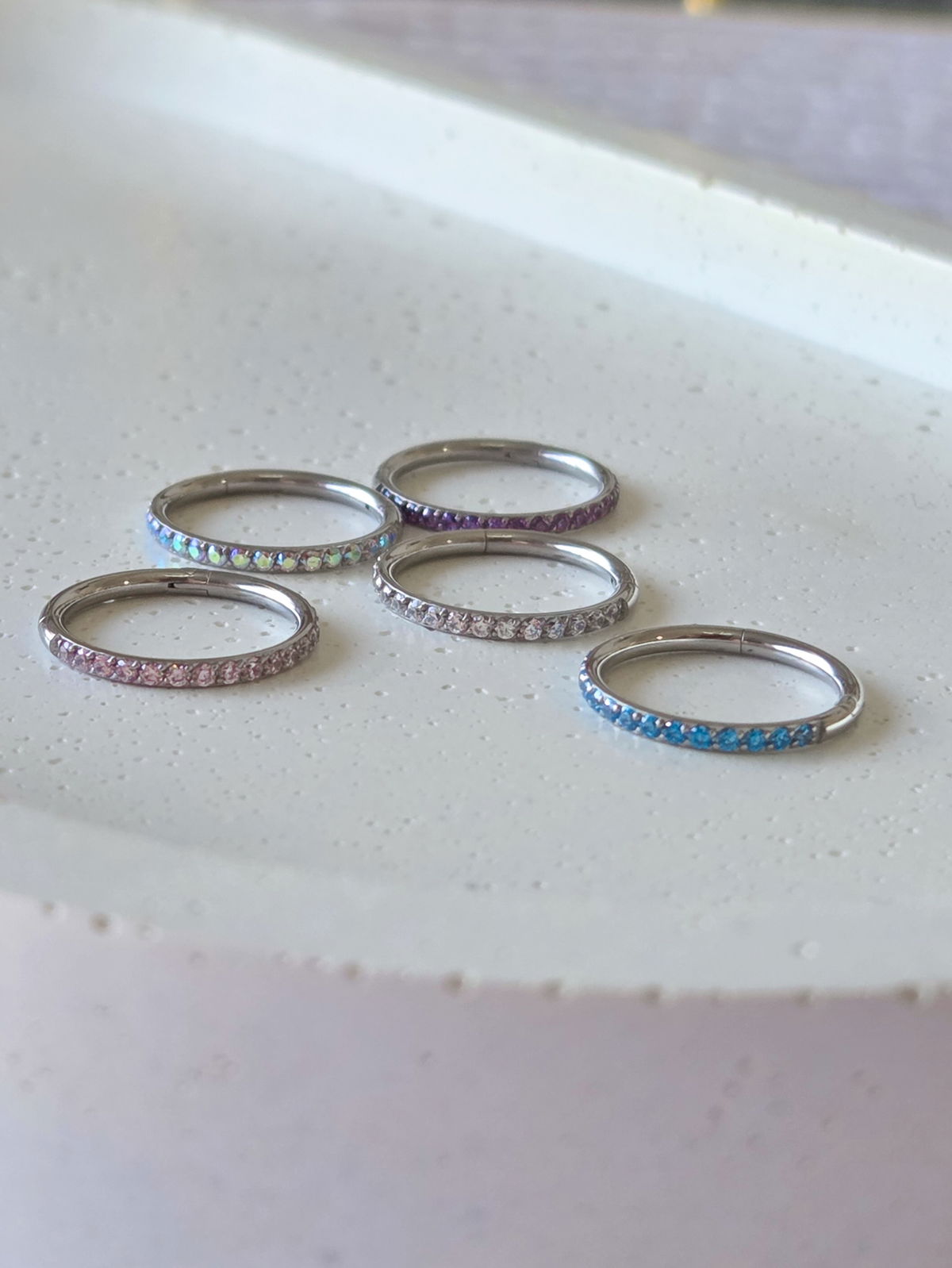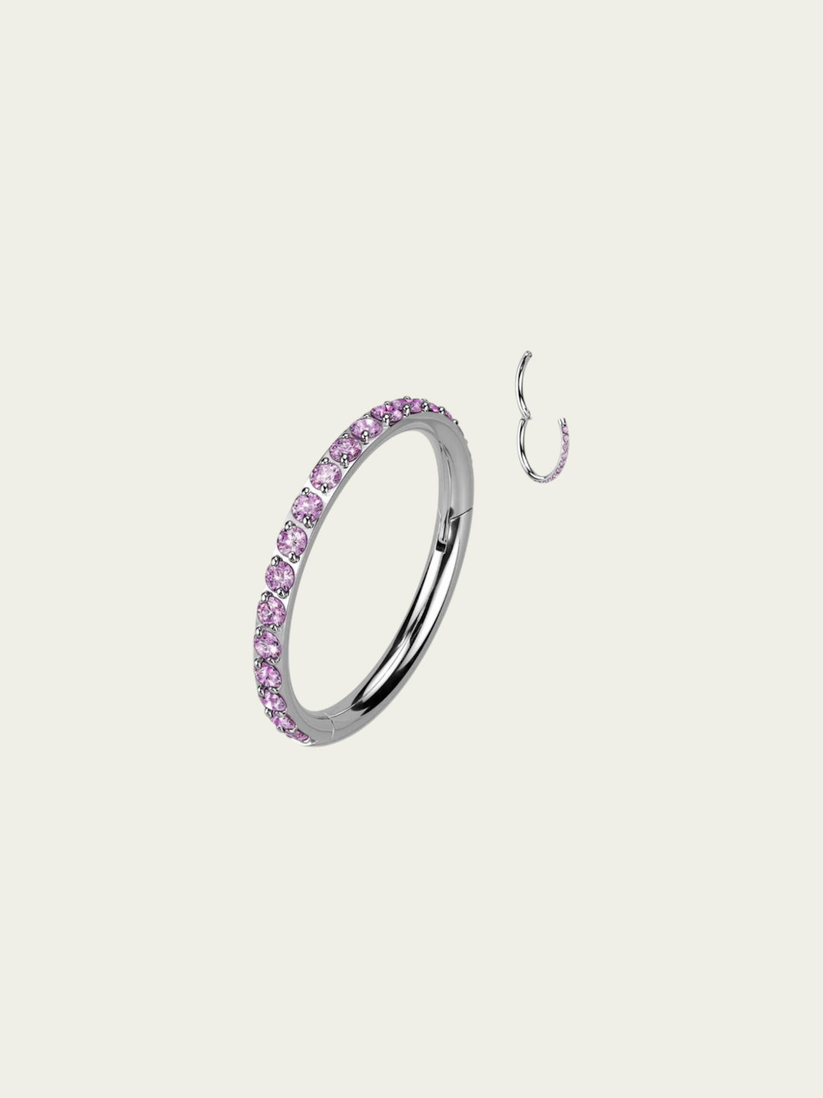Argolla clicker circonias Lila. Este tipo de piercing se puede usar en las perforaciones: nostril, ombligo, tragus, rook, labio,conch, hélix, contra hélix y lóbulo