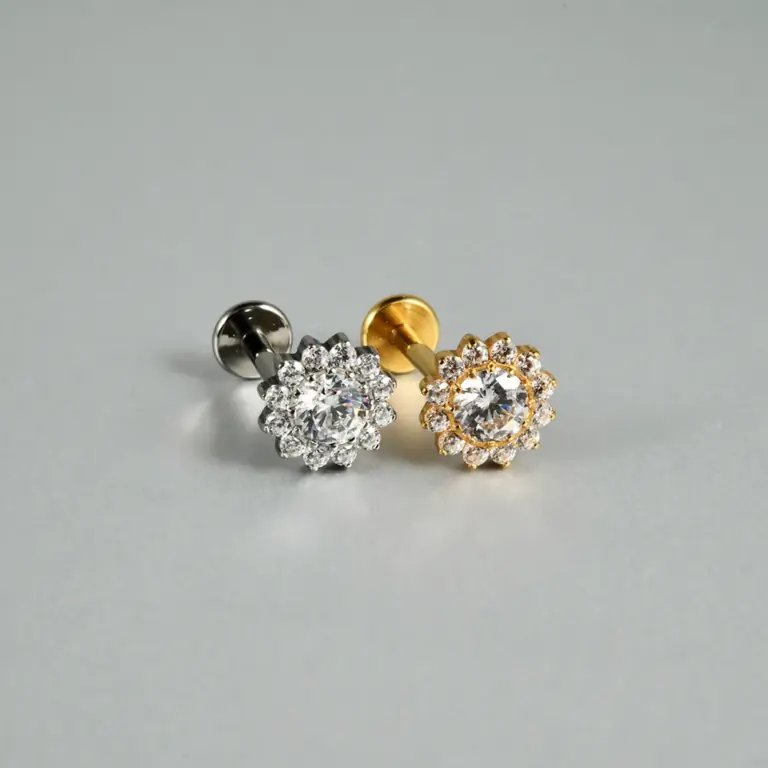Piercing labret forma rayo liso. Este tipo de piercing se puede usar en las perforaciones: flat, hélix, conch, 1er, 2do y 3er lóbulo.