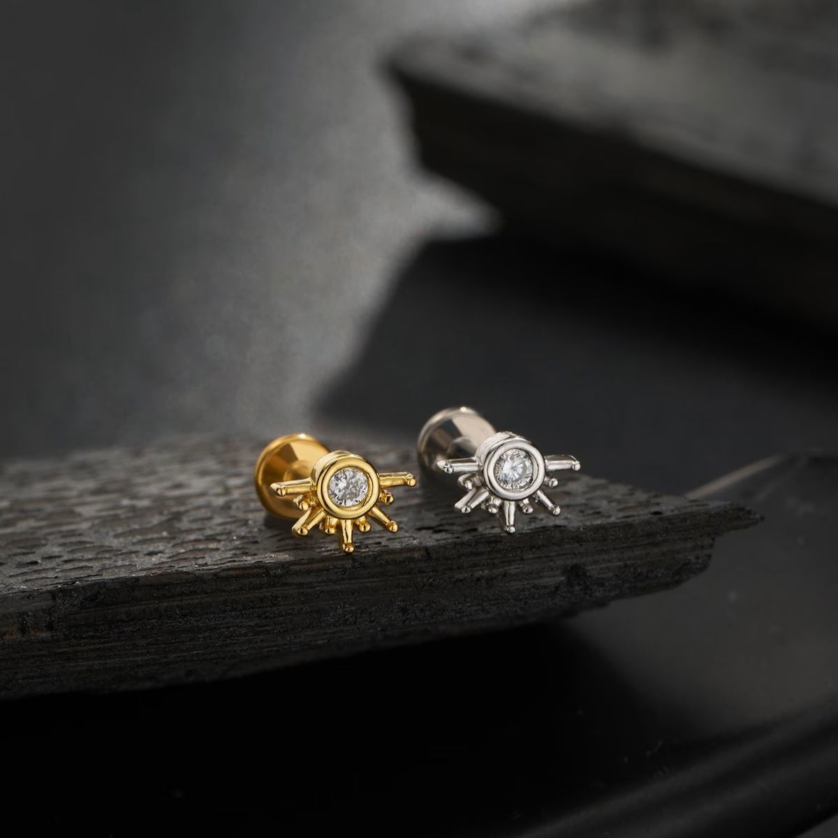 Labret cubic redondo con forma de sol. Este piercing se puede usar en las perforaciones: 1er, 2do y 3er lóbulo, Flat, hélix, lóbulo, conch (ver foto abajo)
