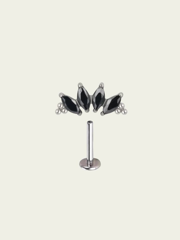Piercing cubics colo negro y filigranas. Este piercing se puede usar en las perforaciones: 1er, 2do y 3er lobulo, flat, conch y hélix (ver foto abajo)