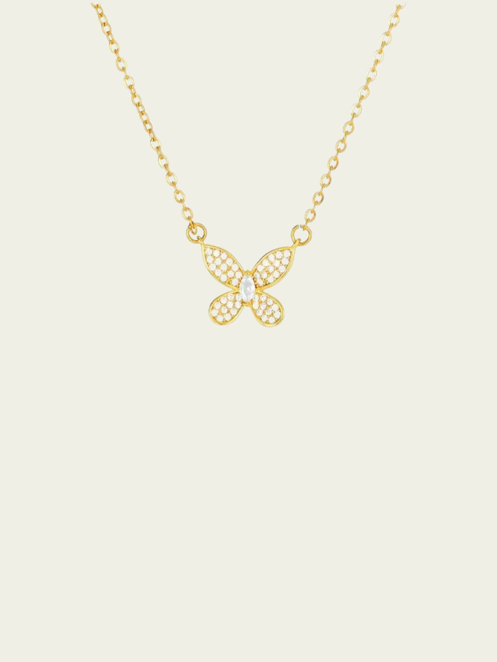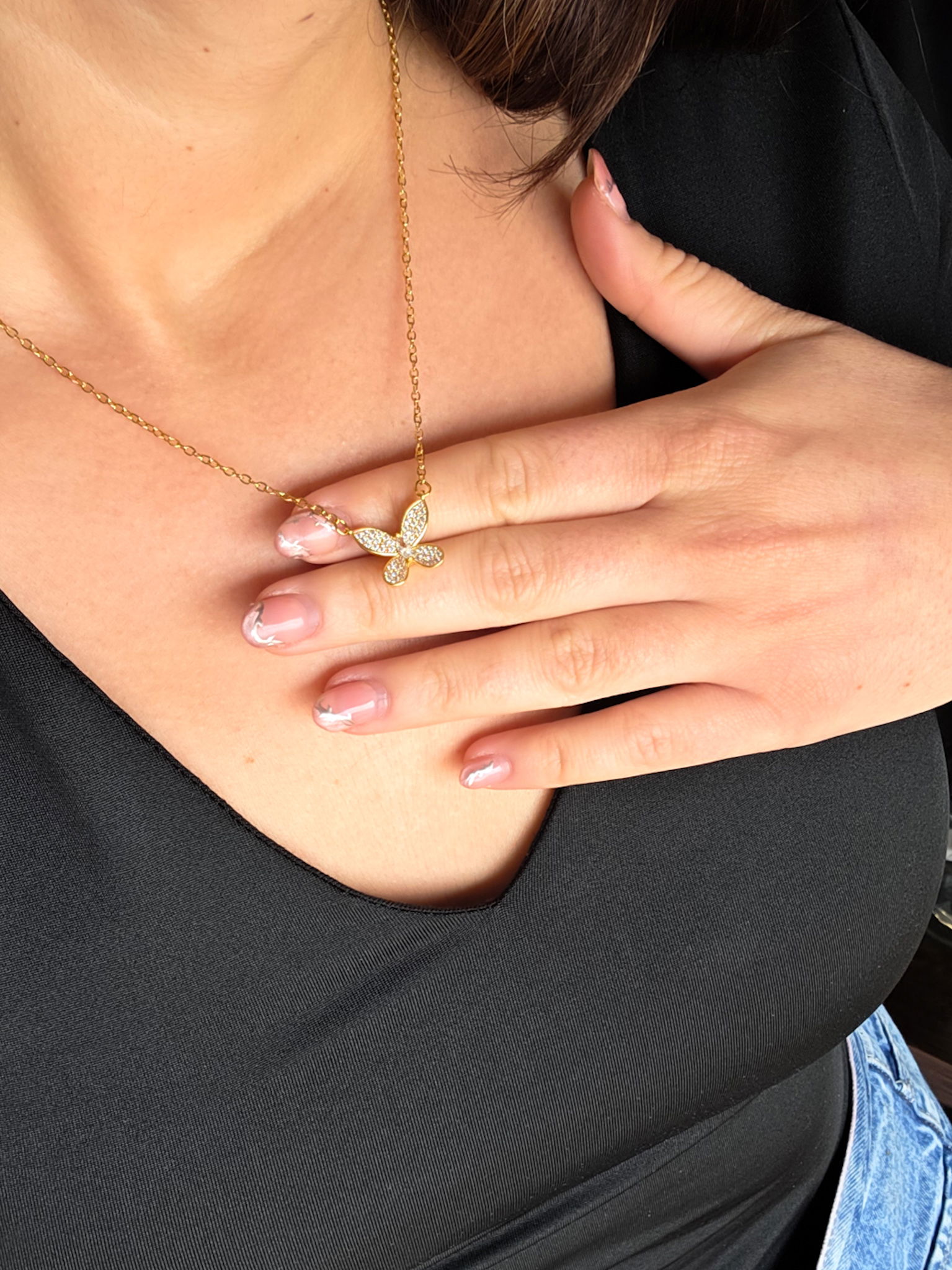 El collar Margarita está diseñado con cadena fina con dije mariposa con circonias blancas