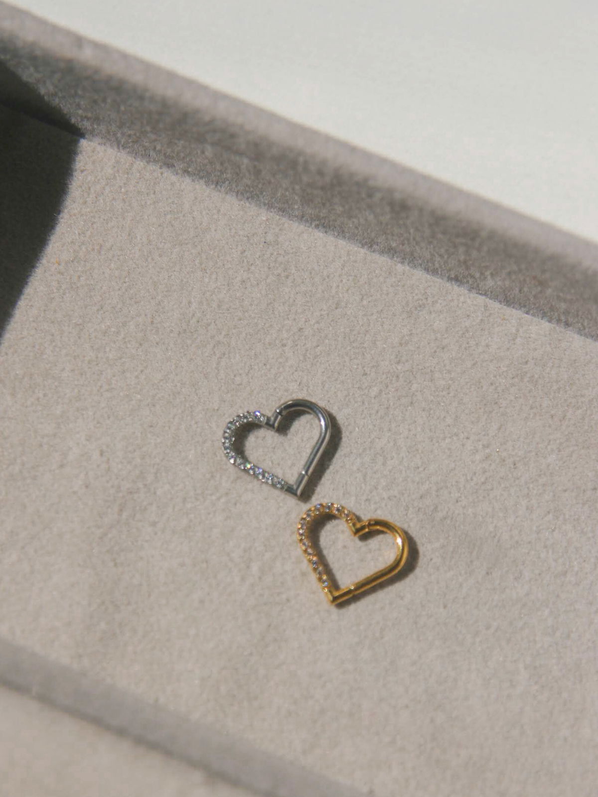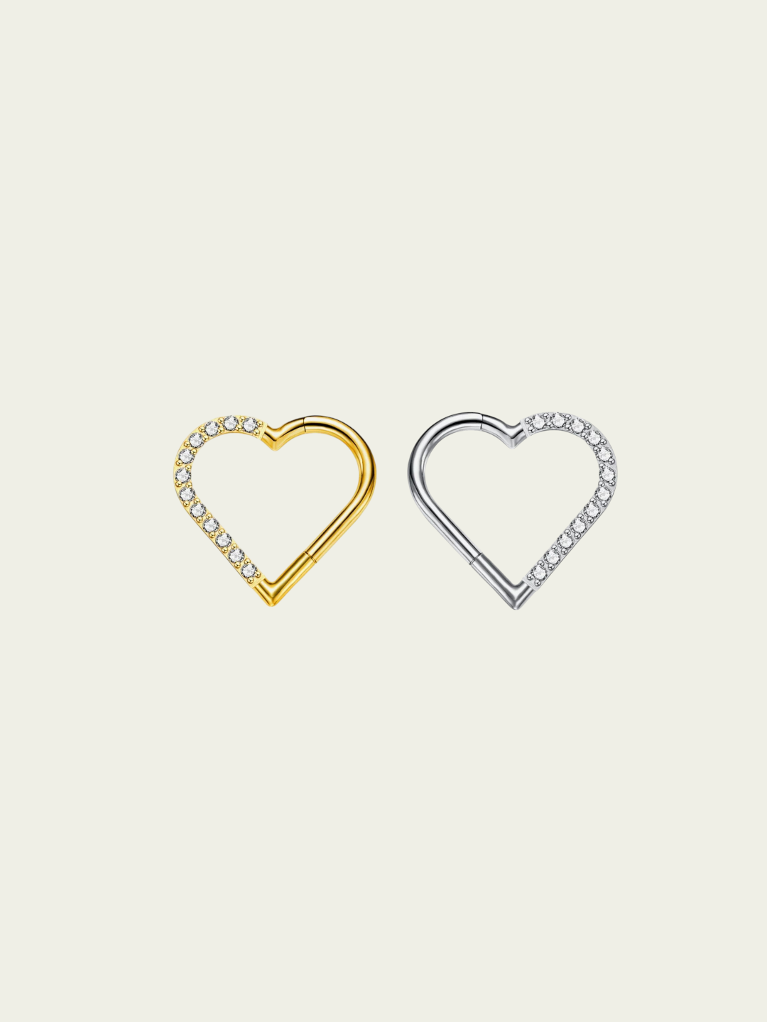 Argolla clicker corazón con circonitas blancas. Este tipo de piercing se puede usar en las perforaciones: daith, hélix, nariz y lóbulo