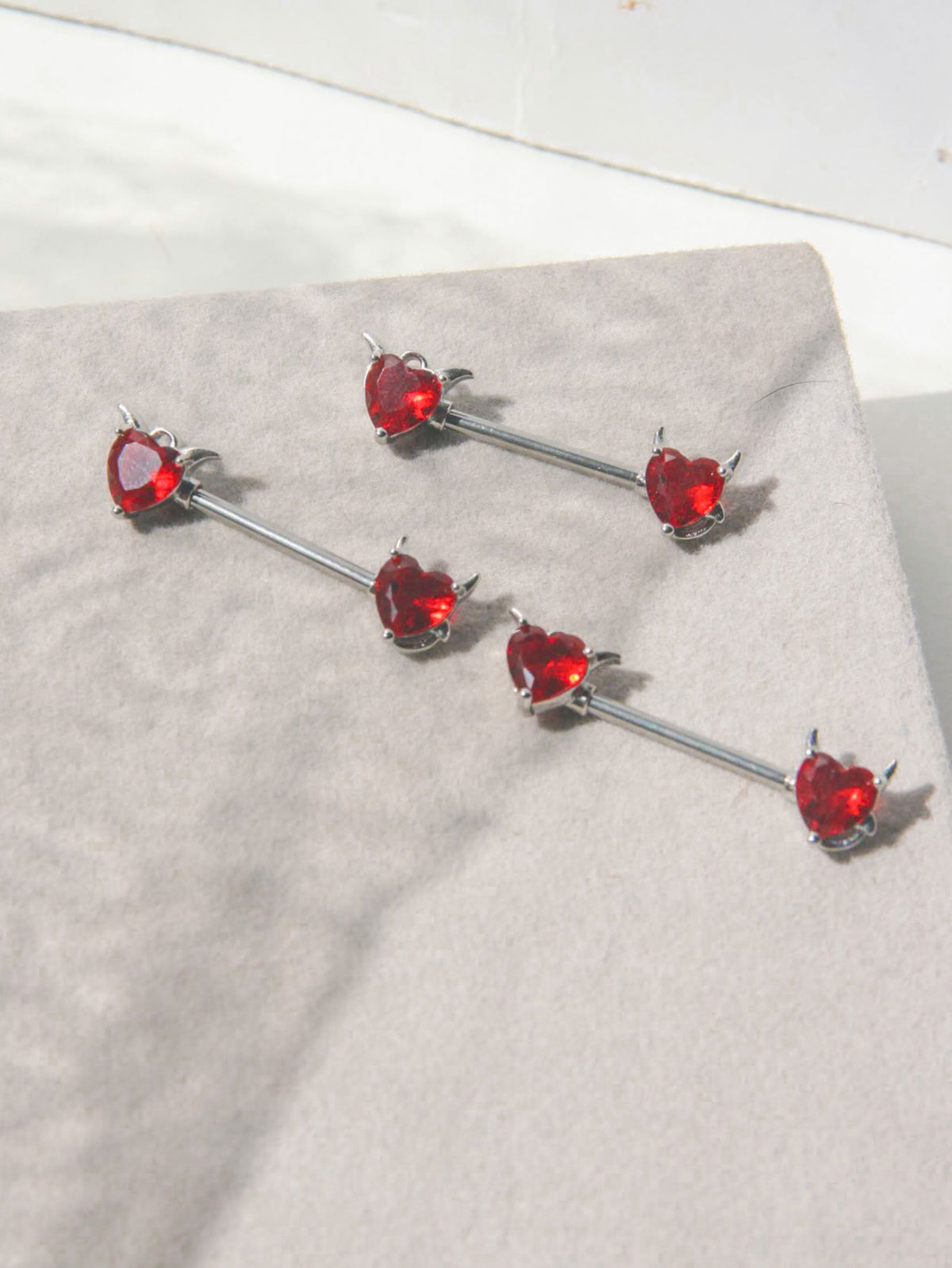 Barbell para el pezón con forma de corazón diablita con cubic rojo. Este tipo de piercing se puede usar en la perforación del pezón